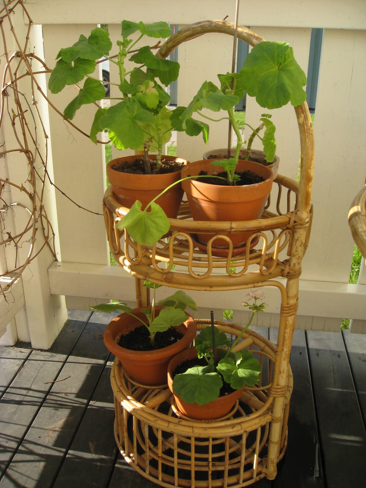 Ett sidobord med handtag och plats för vinflaskor och förfriskningar funkar fint för pelargonkrukorna och ingick i rottingfyndet, som även innehöll ett gulligt runt bord med glasskiva...